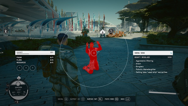 Berbicara mengenai mengelilingi alam semesta, disinilah salah satu kekurangan Starfield, karena fitur menjelajahi para planet diganggu dengan banyaknya layar loading, tidak semulus No Man’s Sky. Jika kalian ingin menuju suatu planet, kalian harus membuka peta galaksi terdahulu, memilih planet tujuan, lalu memilih lokasi pendaratan, dan setelah itu pesawat kalian akan otomatis terbang menuju planet tersebut tanpa kita dapat menikmati pemandangan sekitar. Hal ini merupakan salah satu yang dikomplain para pemain saat gamenya pertama kali rilis. Para planet yang tidak merupakan kisah utama terlihat seperti kosong karena minimnya flora dan fauna untuk kalian jelajahi dan riset.